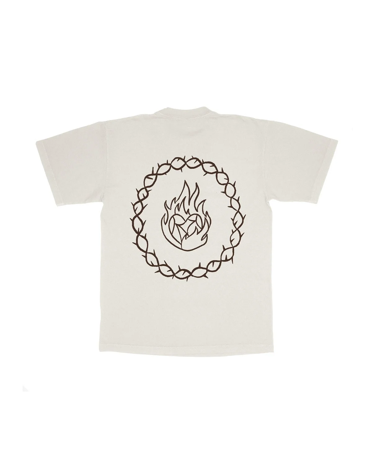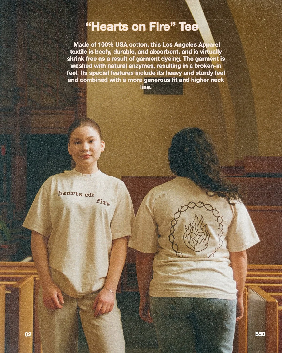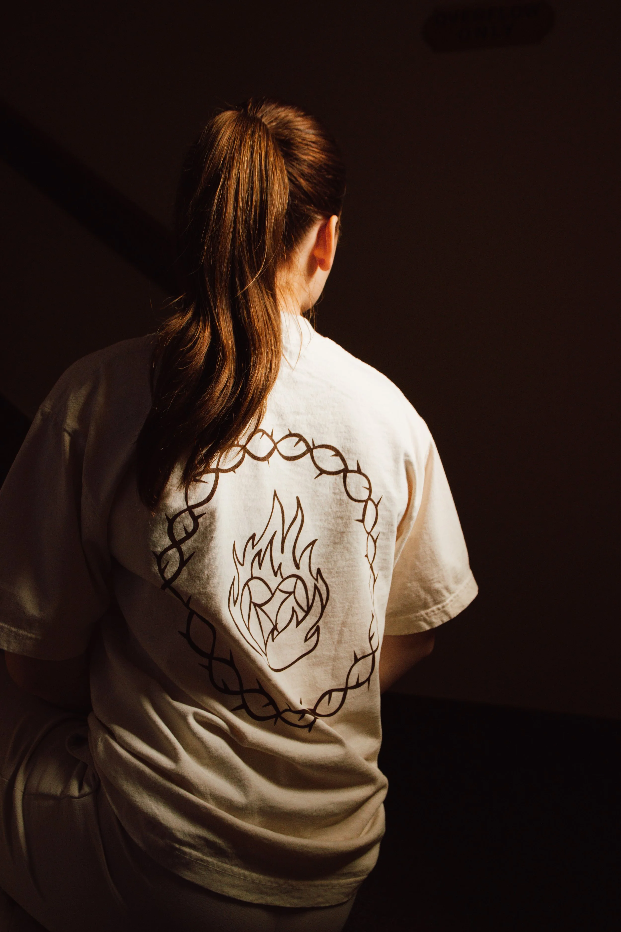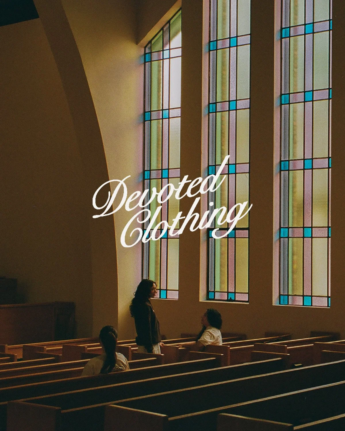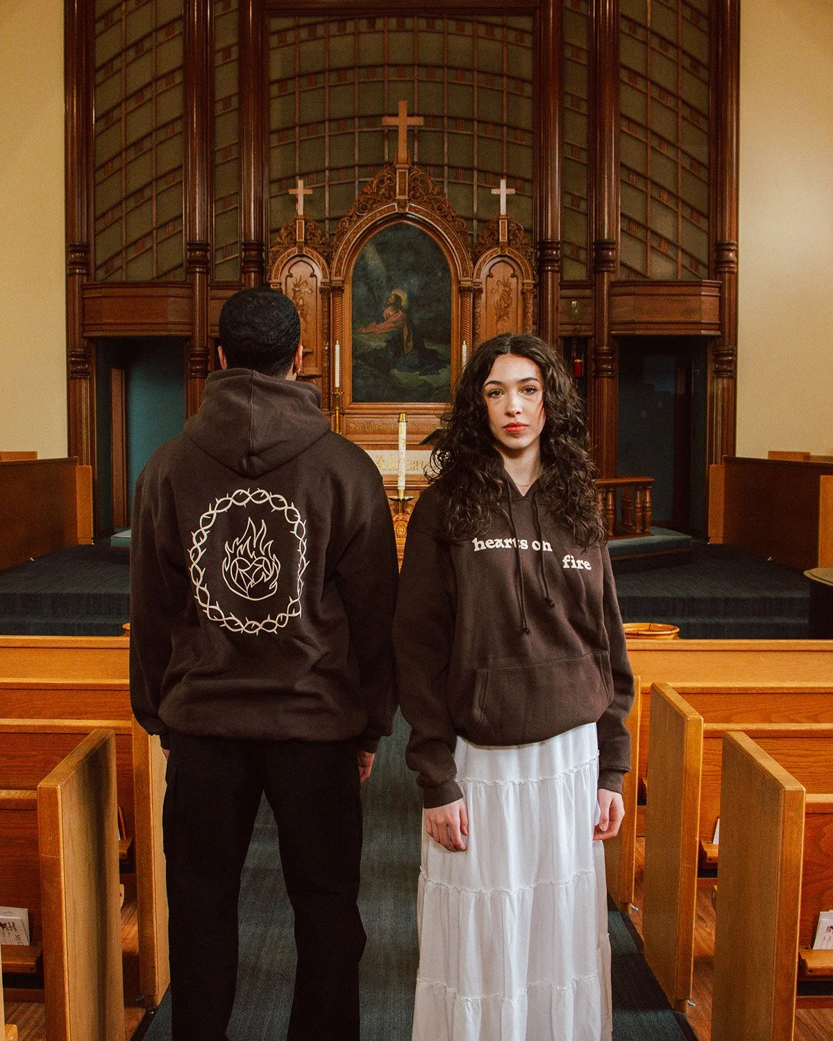One of the main goals of this apparel development and marketing was to visually display the concept of a heart burning for Jesus, while drawing inspiration from the beauty of gothic art, stained glass, and the aesthetic of historic churches. Our entire marketing embraced an orthodox visual tone, from the sacred heart artwork displayed on the apparel, to the photoshoot direction in an old cathedral with stained glass. The result was a collection that invites the viewer to value their devotion to their life, their faith, and to visually inspire and provoke a wonder in ancient art.